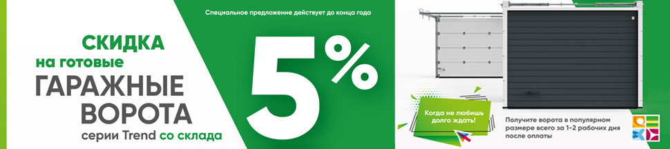 Скидка на готовые гаражные ворота серии TREND 5%. Супербыстрая поставка готовых изделий в популярных размерах.